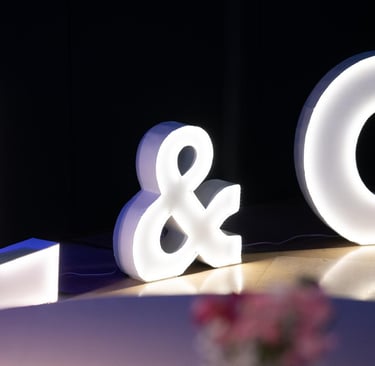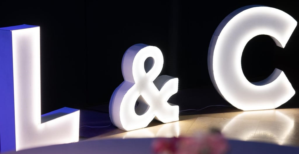 Las letras gigantes con iluminación LED, cortinas de luz cálida y neones personalizados crean ambientes mágicos en bodas y fiestas nocturnas. También triunfan en cenas corporativas para reforzar branding.